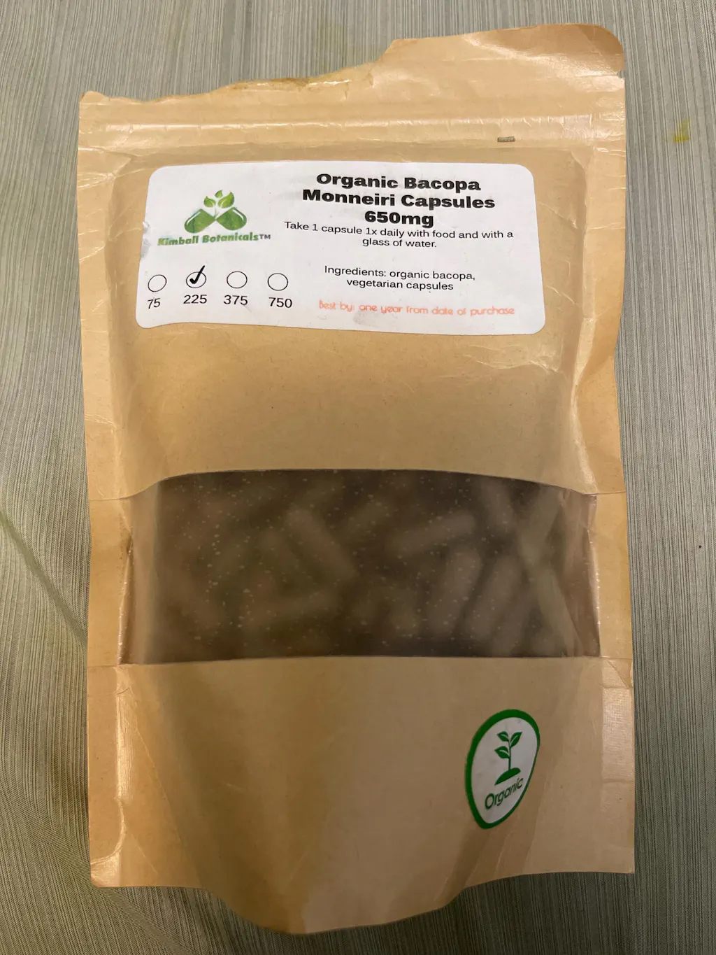 Organic bacopa monnieri capsules. Botanical name bacopa monneiri. Other common names include water hyssop, and brahmi. Your choice of 650mg or 500mg capsules, made with vegetarian or pullulan capsules, and no fillers or binding agents of any kind. Grown in India.